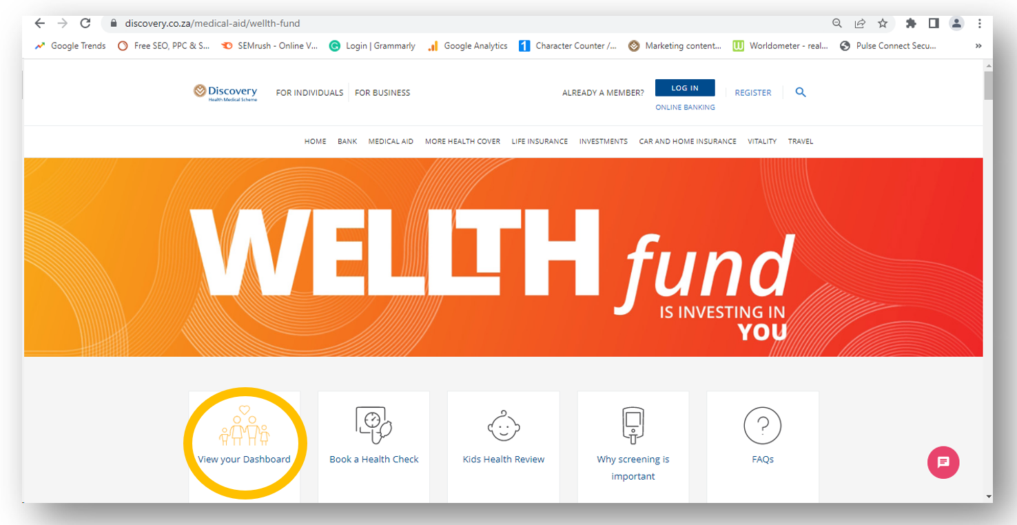 2. Navigate to "View your dashboard" on Discovery Health Medical Scheme's WELLTH Fund page